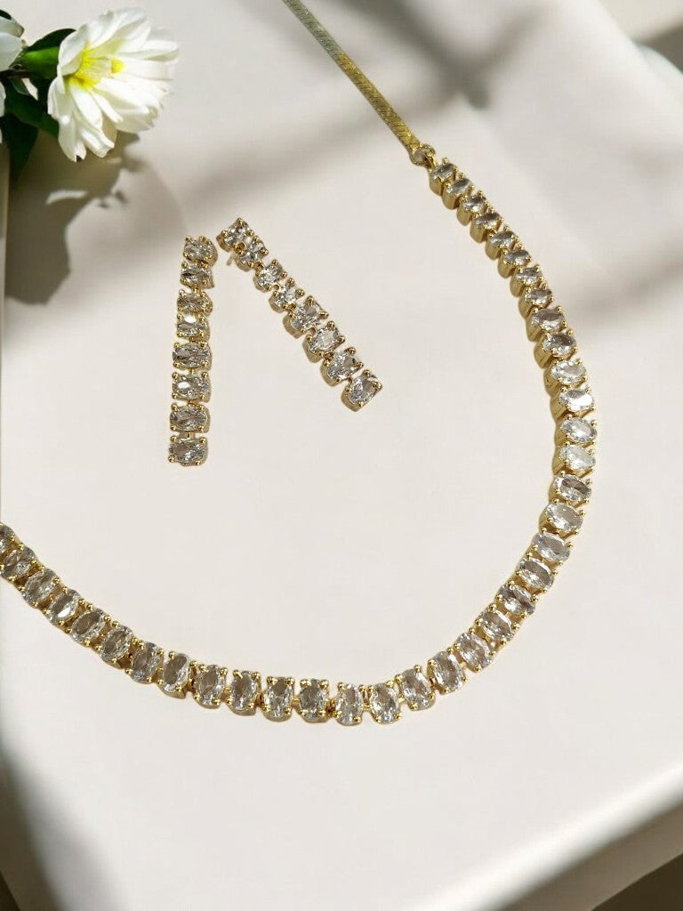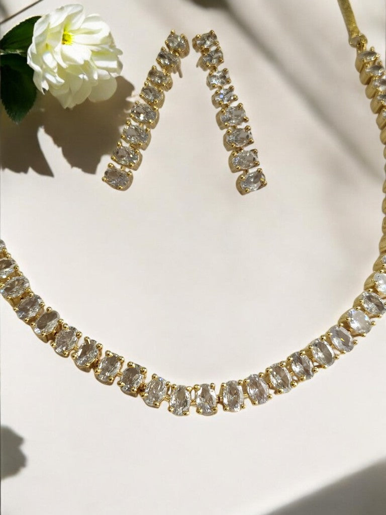 Introducing Tatvika's An American Alang Oval diamond necklace with Dangling Earrings typically features cubic zirconia or other simulated diamonds, offering a cost-effective alternative to real diamonds. These necklaces often showcase intricate designs with sparkling stones. The term "American diamond" is commonly used in India to refer to such simulated diamonds.