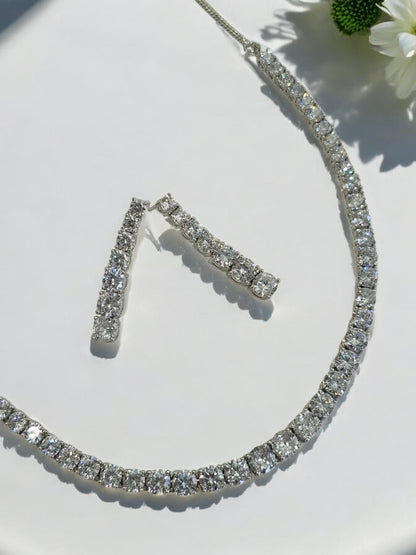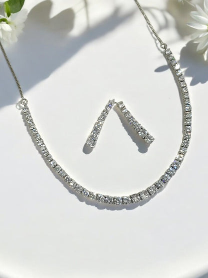 Introducing Tatvika's An American Anurya Small Round diamond necklace with Dangling Earrings typically features cubic zirconia or other simulated diamonds, offering a cost-effective alternative to real diamonds. These necklaces often showcase intricate designs with sparkling stones. The term "American diamond" is commonly used in India to refer to such simulated diamonds.