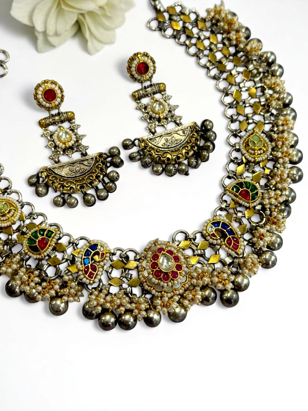 Tatvika’s Unique Necklace Design Can Elevate Your Look: Introducing Blue Green Prerana German silver fusion necklace. Add a touch of regal charm with Brighten your ethnic look with this oxidized necklace set featuring gold-tone Blue Pink Peacock, Flower and Green Mango shaped motifs, white kundan accents, and dangling Golden beads. Comes with matching Dangle earrings. Our exclusive collection of designer jewelry is crafted to withstand the rigors of dance and sweat, ensuring your accessories remain pristine and eye-catching all through Navratri. Investing in anti-tarnish jewelry is a must, especially for those who will be actively participating in the Garba and dandiya-raas. Explore our orthodox jewelry collection, featuring timeless designs that seamlessly blend tradition and modernity. Our curated selection has something to complement every Navratri outfit. Elevate your festival style and make a lasting impression with TATVIKA jewels.