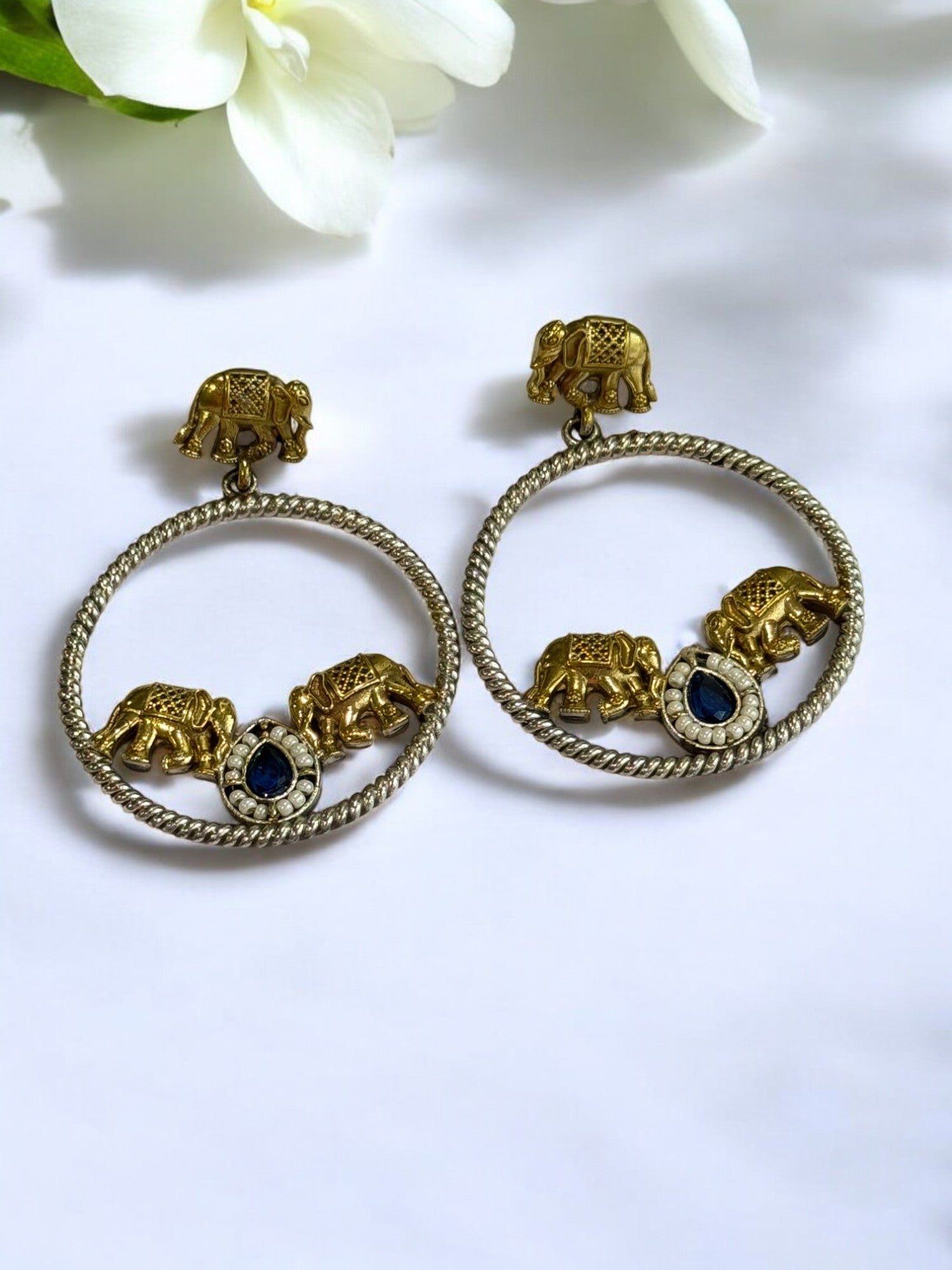 Earring trend in Navratri: Introducing Blue Shivanshi German silver fusion Earrings, radiating royal elegance, these German silver earrings in a dual-tone features are highlighted with blue stone embellishments, intricate detailing, and pearl accents, elephant motif, this pair exudes charm and cultural artistry. Each region boasting its own unique styles and designs. As we approach the vibrant festival of Navratri, the Gujarati Folk Dance. It's the perfect time to explore the latest earring trends that are captivating the Navratri Khelaiya. Each khelaiyas are gravitating towards earrings that not only complement their traditional attire but also showcase their matching with stylish Chaniya choli. Our earrings reflect personal style with a perfect balance of modernity and timeless appeal. Explore TATVIKA’S collection for your ideal statement pair.