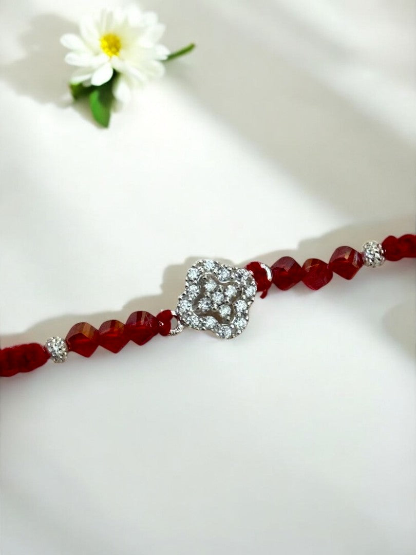 Celebrate this Raksha Bandhan with TATVIKA: the timeless beauty of our Diamond Flower Tarunika Pure Silver Rakhi, handcrafted in 92.5 sterling silver Rakhi featuring a beautifully crafted Shimmering Diamond Flower centerpiece adorned with Shimmering accents. Set on a vibrant red thread and brown beads, it brings together tradition and elegance in perfect harmony. Blending tradition with elegance, this Rakhi isn’t just a thread—it's a sparkling symbol of love, protection, and lifelong connection. A precious keepsake for your brother, this silver rakhi adds a festive sparkle to your heartfelt celebration. Because some bonds deserve nothing but the purest!