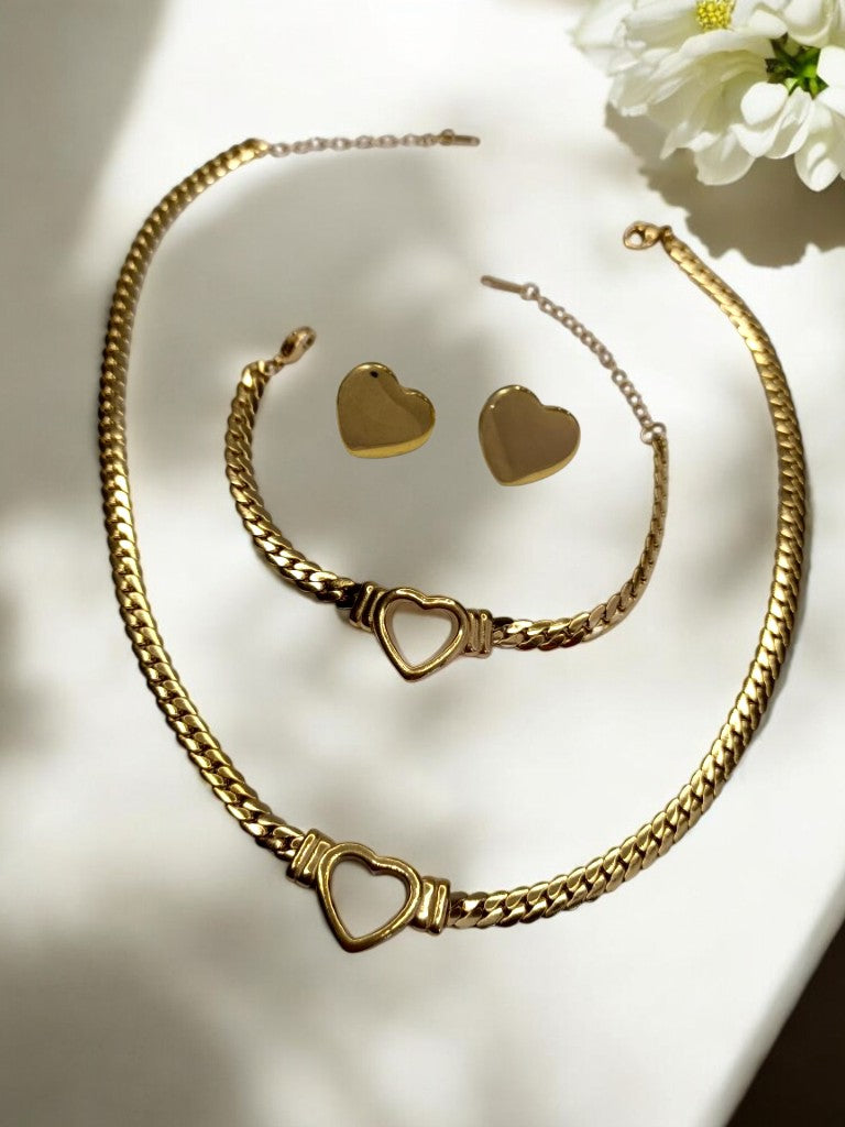 GOLD HEART KIMONE NECKLACE,EARRINGS AND BRACELET (COMBO)