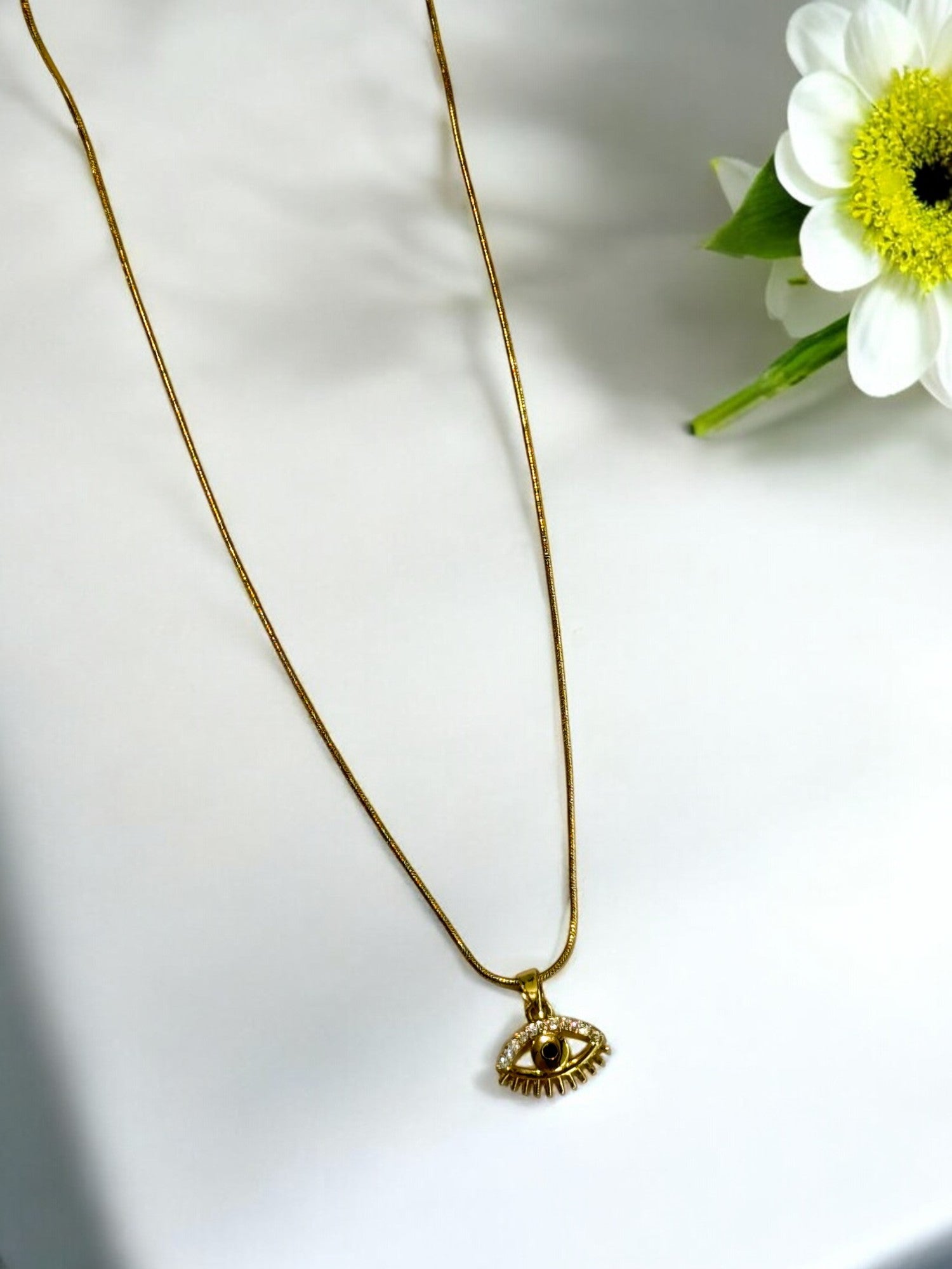 Elevate your style with TATVIKA'S exquisite Golden Evil Eye Kannon Necklace, beautiful minimalist diamond Evil eye pendent with golden chain, the perfect blend of elegance and sophistication. Gold Plated Chain Crafted with meticulous attention to detail, this set adds a touch of luxury to any outfit. Ideal for special occasions or as a thoughtful gift, its timeless design ensures it will be a cherished addition to any jewelry collection.