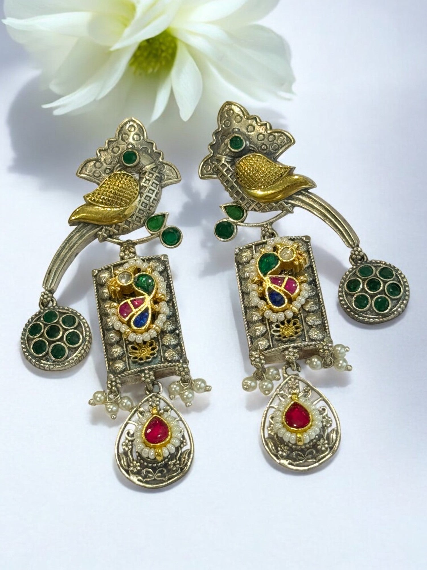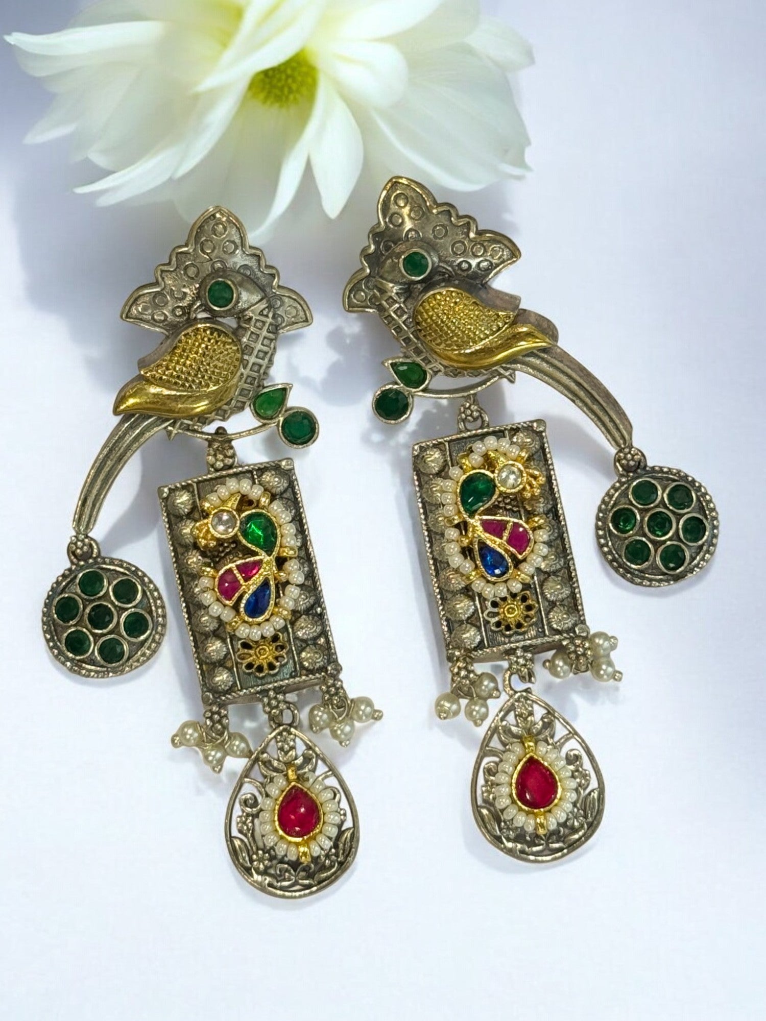 Earring trend in Navratri: Introducing Green Hrida German silver fusion Earrings, radiating royal elegance, these German silver earrings in a dual-tone features are highlighted with Green stone embellishments, intricate detailing, and pearl accents, Birds motif, this pair exudes charm and cultural artistry. Each region boasting its own unique styles and designs. As we approach the vibrant festival of Navratri, the Gujarati Folk Dance. It's the perfect time to explore the latest earring trends that are captivating the Navratri Khelaiya. Each khelaiyas are gravitating towards earrings that not only complement their traditional attire but also showcase their matching with stylish Chaniya choli. Our earrings reflect personal style with a perfect balance of modernity and timeless appeal. Explore TATVIKA’S collection for your ideal statement pair.