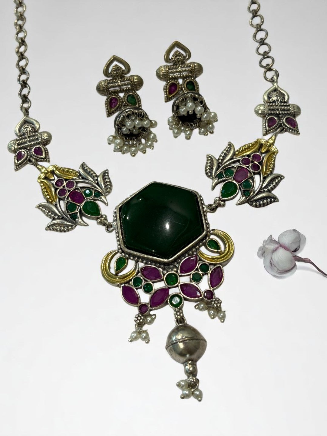 Tatvika’s Unique Necklace Design Can Elevate Your Look: Introducing Green Rekha German silver fusion necklace. Bold and elegant, this oxidized silver necklace features a striking Green centerpiece framed with green-Pink enamel leaves and golden highlights. Paired with matching earrings adorned with pearls, Our exclusive collection of designer jewelry is crafted to withstand the rigors of dance and sweat, ensuring your accessories remain pristine and eye-catching all through Navratri. Investing in anti-tarnish jewelry is a must, especially for those who will be actively participating in the Garba and dandiya-raas. Explore our orthodox jewelry collection, featuring timeless designs that seamlessly blend tradition and modernity. Our curated selection has something to complement every Navratri outfit. Elevate your festival style and make a lasting impression with TATVIKA jewels.