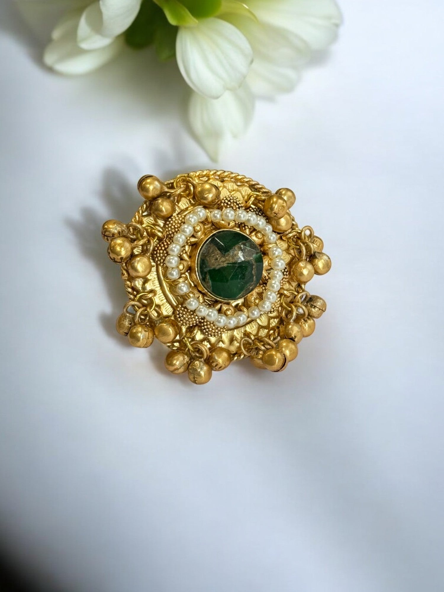 Elevate Your Navratri Style with TATVIKA: Discover elegance and innovation with Green Viranshi German silver Rings. Gold tone Finger Ring crafted in a unique round design. The centerpiece features of deep Green stones around beads and Jingles. As the vibrant festival of Navratri approaches, it's time to start planning your Classic look. One essential element that can truly elevate your ensemble is the right matching jewelry with your chaniya-choli or Navratri look. From classic designs to contemporary pieces, the perfect jewelry can transform your appearance and make you feel confident and beautiful throughout the garba and dodhiya. Explore TATVIKA’S stunning collection today for grace and glamour.