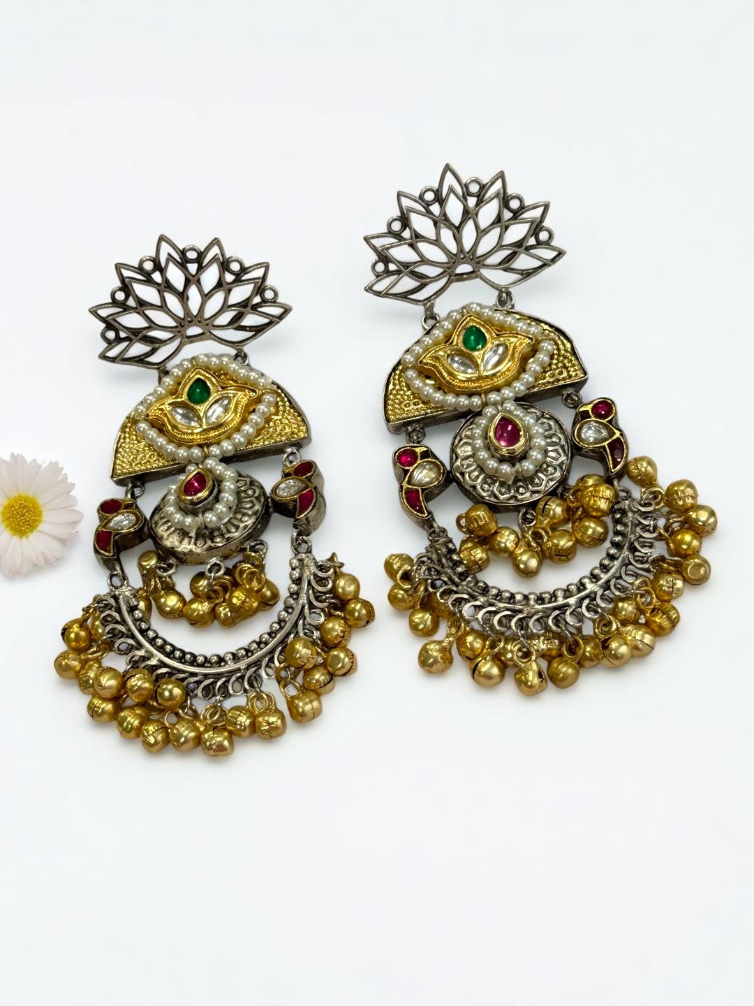 Earring trend in Navratri: Introducing Magenta Birds Gracy German silver fusion Earrings, Bold and unique, these German silver earrings feature a beautiful blend of oxidized silver and golden tones, the earrings are adorned with temple-inspired motifs, delicate beadwork, and colored stones in ruby and emerald hues. The lotus-shaped top and cascading jhumka-style bells Dangle - perfect for adding an artistic touch. Each region boasting its own unique styles and designs. As we approach the vibrant festival of Navratri, the Gujarati Folk Dance. It's the perfect time to explore the latest earring trends that are captivating the Navratri Khelaiya. Each khelaiyas are gravitating towards earrings that not only complement their traditional attire but also showcase their matching with stylish Chaniya choli. Our earrings reflect personal style with a perfect balance of modernity and timeless appeal. Explore TATVIKA’S collection for your ideal statement pair.