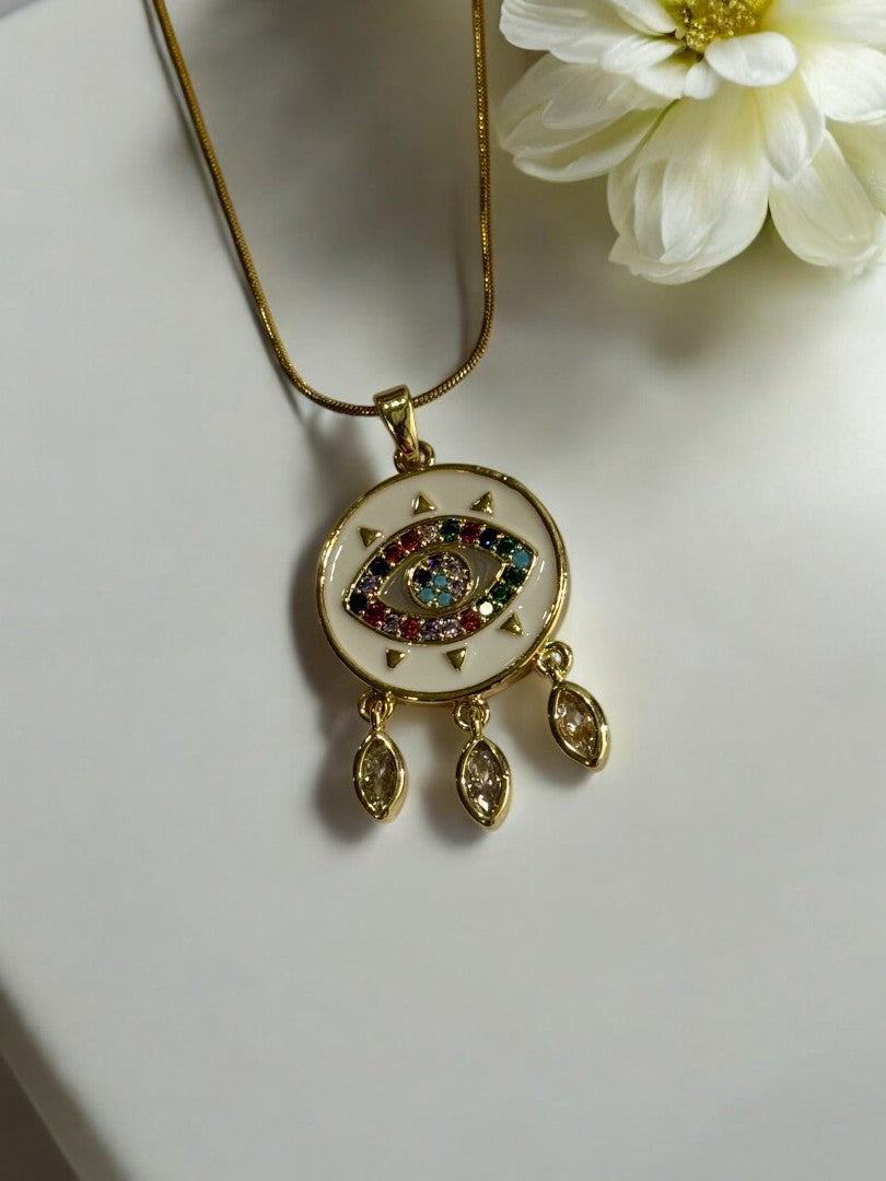 Elevate your style with TATVIKA'S exquisite Multi Diamond Mario Necklace, Necklace Features Unique multi diamond evil eye pendent, high-quality, stylish accessories inspired by your favorite anime. A warm gold chain Necklace give a touch of timeless elegance for any occasion. Made with hypoallergenic and comfortable materials. Perfect for fans and collectors.