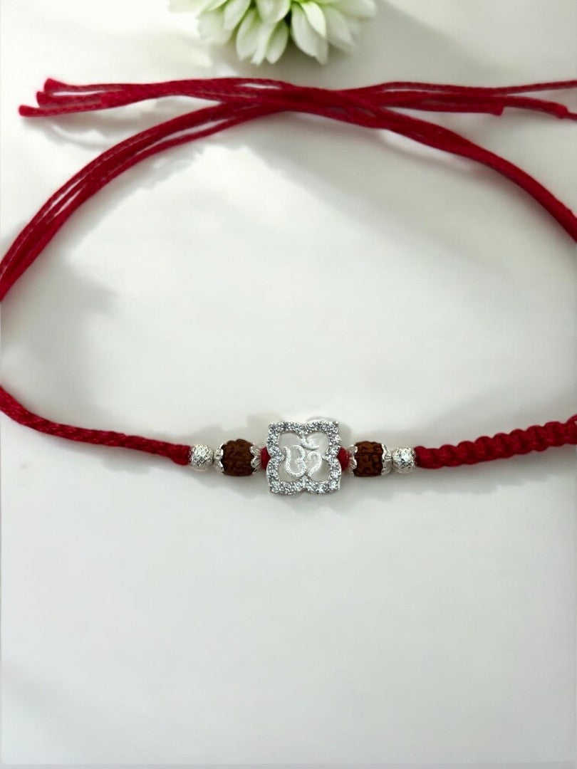 Celebrate this Raksha Bandhan with TATVIKA: the timeless beauty of our Om Trisha Pure Silver Rakhi, handcrafted in 92.5 sterling silver Rakhi featuring a beautifully crafted Om around Diamond with flower shape centerpiece adorned with Shimmering accents. Set on a vibrant red thread, Rudraksh and dotted sparkling silver beads, it brings together tradition and elegance in perfect harmony. Blending tradition with elegance, this Rakhi isn’t just a thread—it's a sparkling symbol of love, protection, and lifelong connection. A precious keepsake for your brother, this silver rakhi adds a festive sparkle to your heartfelt celebration. Because some bonds deserve nothing but the purest!