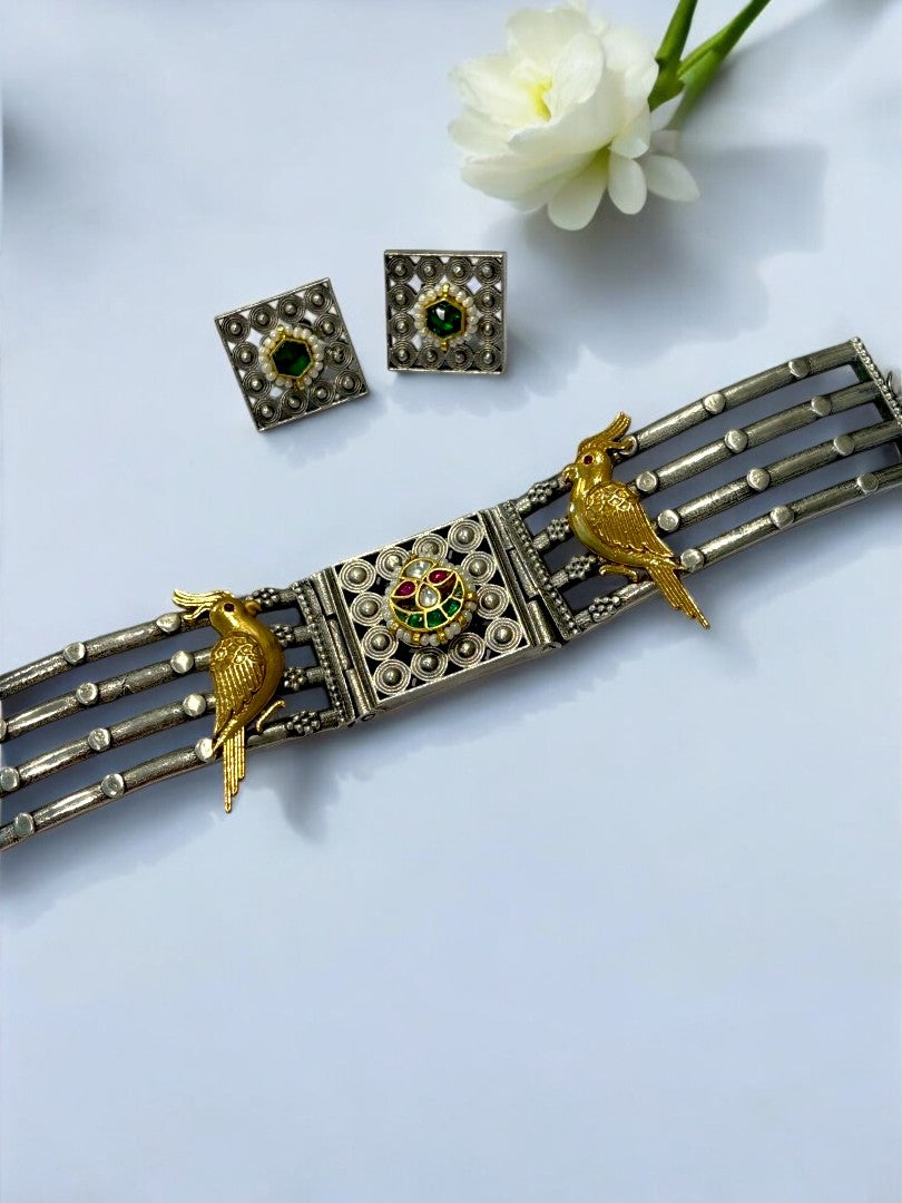Tatvika’s Unique Necklace Design Can Elevate Your Look: Introducing Multi Ravina German silver fusion necklace. Bold and elegant, this oxidized silver necklace features a square centerpiece framed with green-Pink enamel Flower, Golden Bird Motif. Paired with matching Stud earrings, our exclusive collection of designer jewelry is crafted to withstand the rigors of dance and sweat, ensuring your accessories remain pristine and eye-catching all through Navratri. Investing in anti-tarnish jewelry is a must, especially for those who will be actively participating in the Garba and dandiya-raas. Explore our orthodox jewelry collection, featuring timeless designs that seamlessly blend tradition and modernity. Our curated selection has something to complement every Navratri outfit. Elevate your festival style and make a lasting impression with TATVIKA jewels.