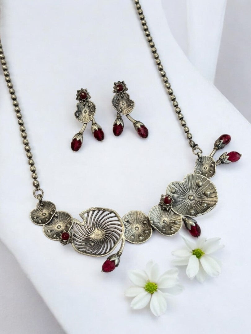 Tatvika’s Unique Necklace Design Can Elevate Your Look: Introducing Red Aisha German silver fusion necklace. Inspired by the elegance of lotus leaves and adorned with Red Multi stone accents, this set features a beautifully detailed necklace paired with matching earrings. The intricate floral engravings and oxidized silver finish exude a vintage charm. Our exclusive collection of designer jewelry is crafted to withstand the rigors of dance and sweat, ensuring your accessories remain pristine and eye-catching all through Navratri. Investing in anti-tarnish jewelry is a must, especially for those who will be actively participating in the Garba and dandiya-raas. Explore our orthodox jewelry collection, featuring timeless designs that seamlessly blend tradition and modernity. Our curated selection has something to complement every Navratri outfit. Elevate your festival style and make a lasting impression with TATVIKA jewels.
