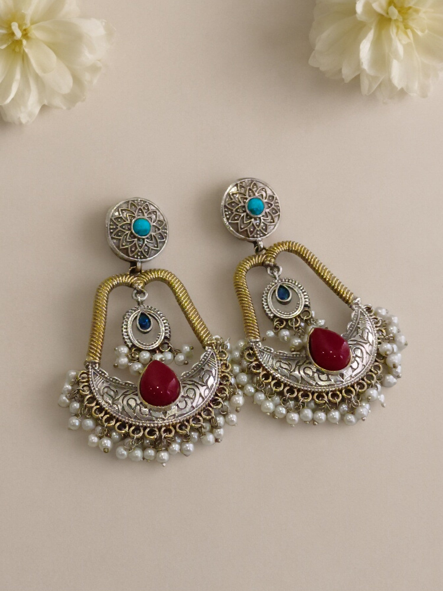 Introducing Red & Blue Bhavyam German silver fusion earrings, where classic elegance meets modern flair. Handcrafted by skilled artisans, each pair combines timeless charm with fresh designs, ideal for today's fashion-forward individuals. Drawing inspiration from current trends, our earrings reflect personal style with a perfect balance of modernity and timeless appeal. Explore our collection for your ideal statement pair.