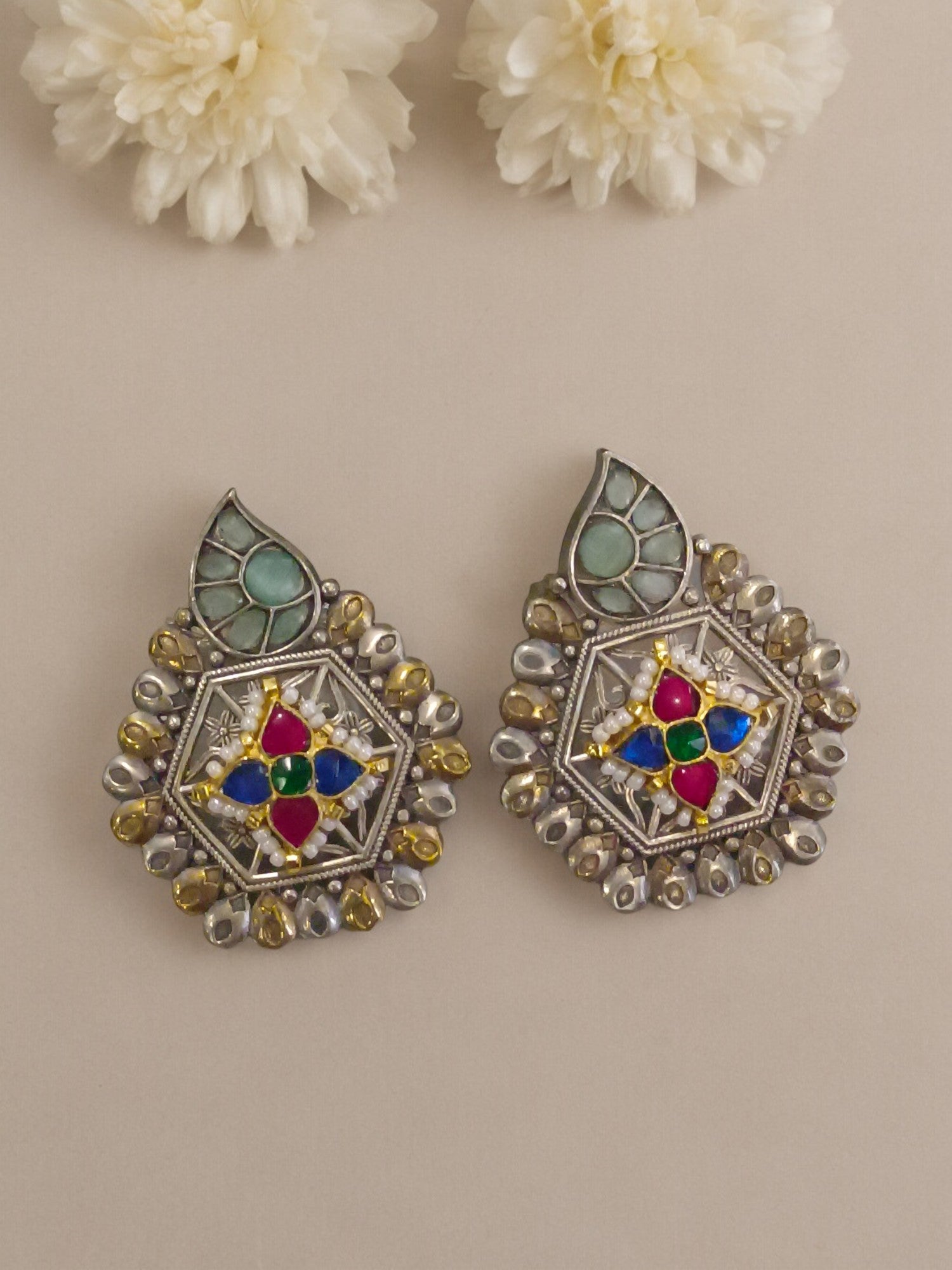 Introducing Sea Blue Ananya German silver fusion earrings, where classic elegance meets modern flair. Handcrafted by skilled artisans, each pair combines timeless charm with fresh designs, ideal for today's fashion-forward individuals. Drawing inspiration from current trends, our earrings reflect personal style with a perfect balance of modernity and timeless appeal. Explore our collection for your ideal statement pair.