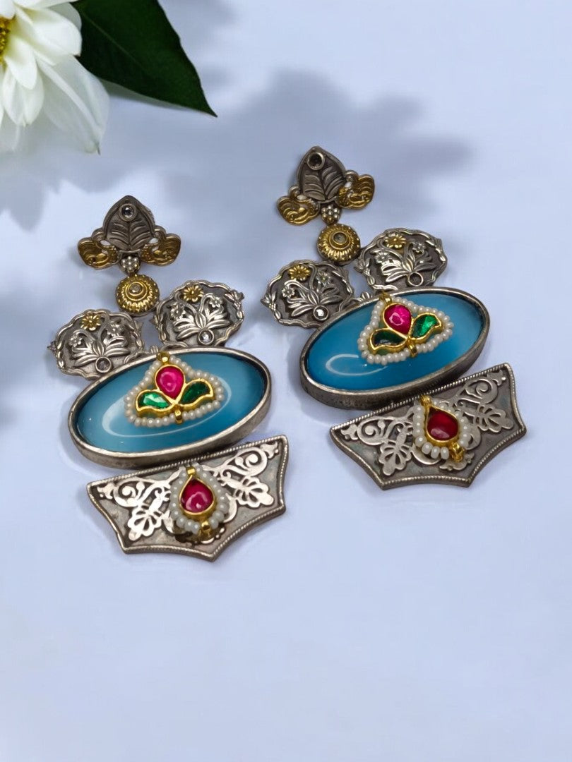 Earring trend in Navratri: Introducing Sky Blue Aadidevi German silver fusion earrings, These Dangling Earring each region boasting its own unique styles and designs. As we approach the vibrant festival of Navratri, the Gujarati Folk Dance. It's the perfect time to explore the latest earring trends that are captivating the Navratri Khelaiya. Each khelaiyas are gravitating towards earrings that not only complement their traditional attire but also showcase their matching with stylish Chaniya choli. Our earrings reflect personal style with a perfect balance of modernity and timeless appeal. Explore TATVIKA’S collection for your ideal statement pair.